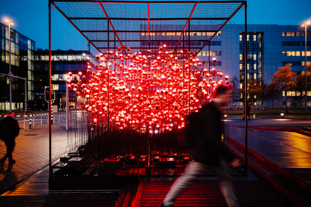 Bij de entree van The Base C staat Desire van het Taiwanese UxU Studio: rode lippen opgebouwd uit zo’n 1.500 lichtpunten. Door de positie op de hoek verandert het beeld terwijl je voorbijloopt — van helder gevormde lippen naar een kloppende hartslag. Met deze wisseling speelt UxU Studio met verlangen, emotie en communicatie. De opvallende plek maakt Desire meteen herkenbaar voor iedereen die het district binnenrijdt of verlaat.