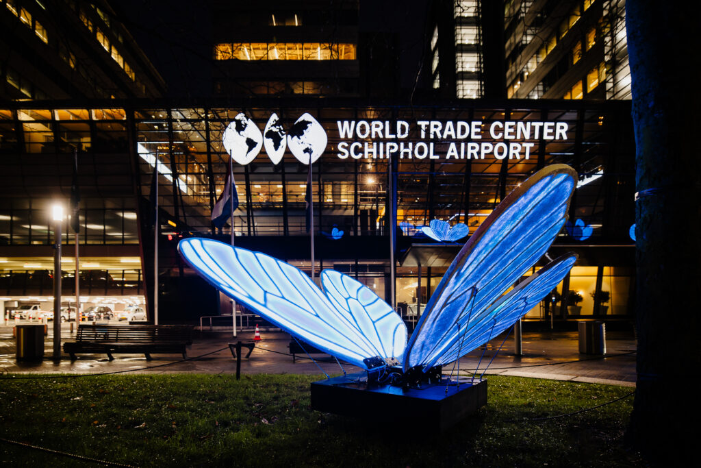 Voor WTC Schiphol Airport staan vijf grote, blauw oplichtende vlinders van de Japanse kunstenaar Masamichi Shimada. Het werk verwijst naar het bekende “butterfly effect”: kleine bewegingen kunnen grote veranderingen veroorzaken. Door de enorme schaal en het zachte blauwe licht ontstaat een opvallend beeld dat het zakelijke gebied een onverwachte poëtische laag geeft.